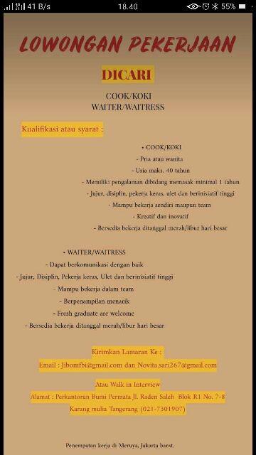 Lowongan Kerja Bingso Story Kim S Food Restaurant Lokerjakarta Id from www.lokerjakarta.id Update loker di jakarta barat bulan ini untuk anda yang membutuhkan info lowongan pekerjaan terkini. Didirikan pada tanggal 2 februari 1970. Apabila kamu dimintai uang sewaktu mendaftar atau wawancara, segera laporkan postingan ini.